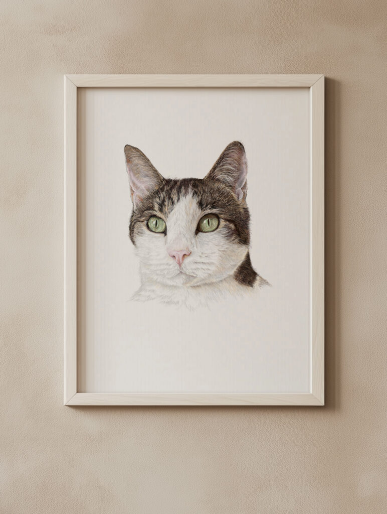 Referensbild och färdig målning och en mockup på hur Trilli kan se ut inramad.